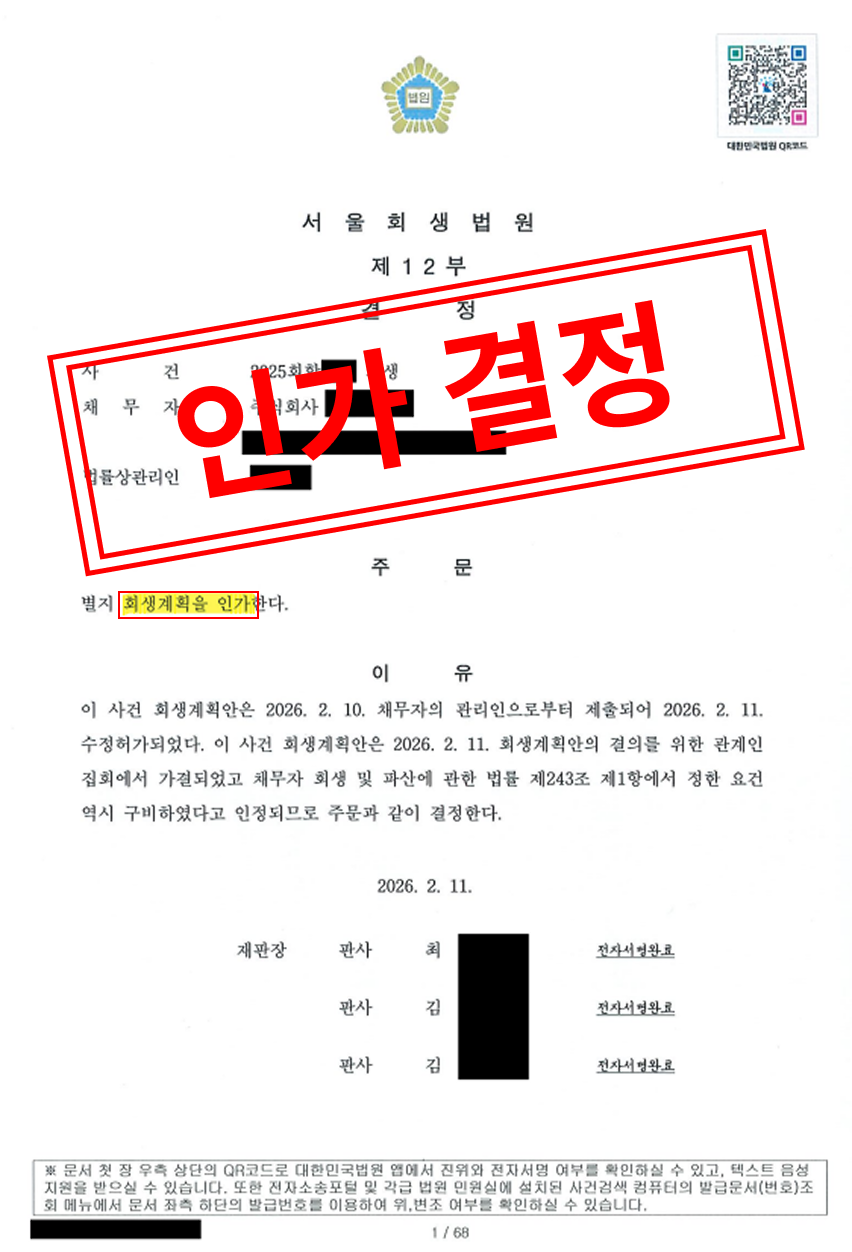 2026년 2월 11일 - 관계인집회 가결 및 회생계획 인가 결정