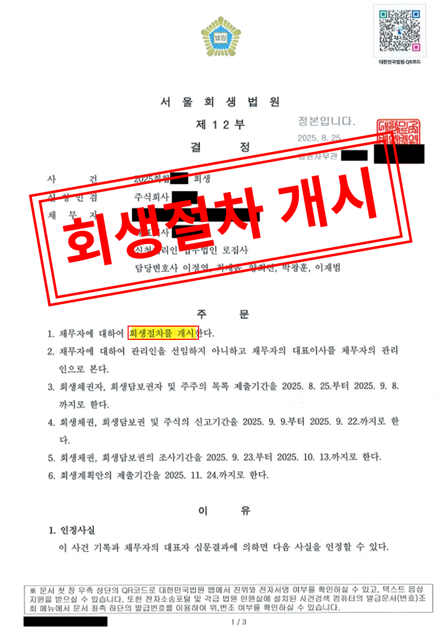 2025년 8월 25일 - 회생절차 개시 결정